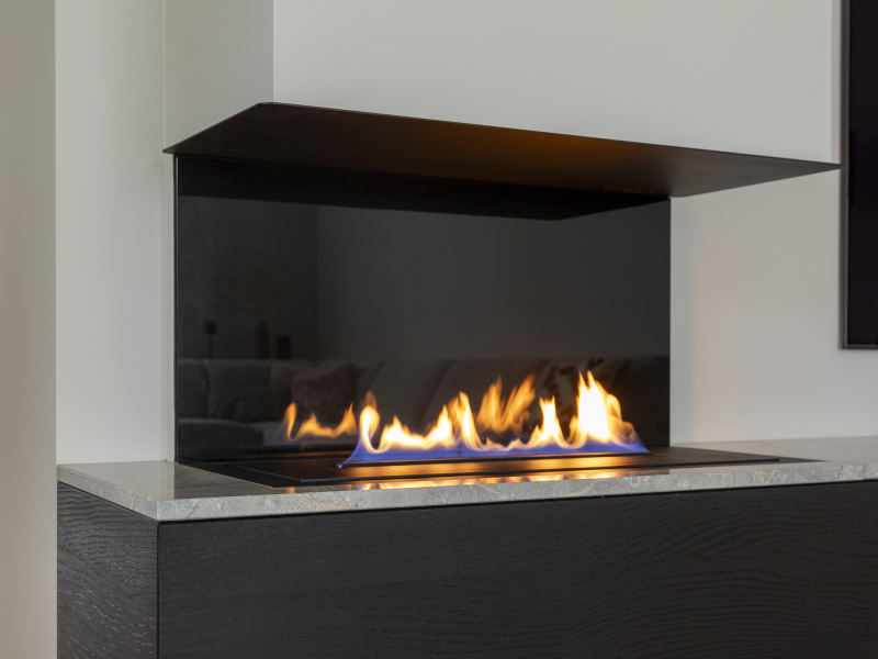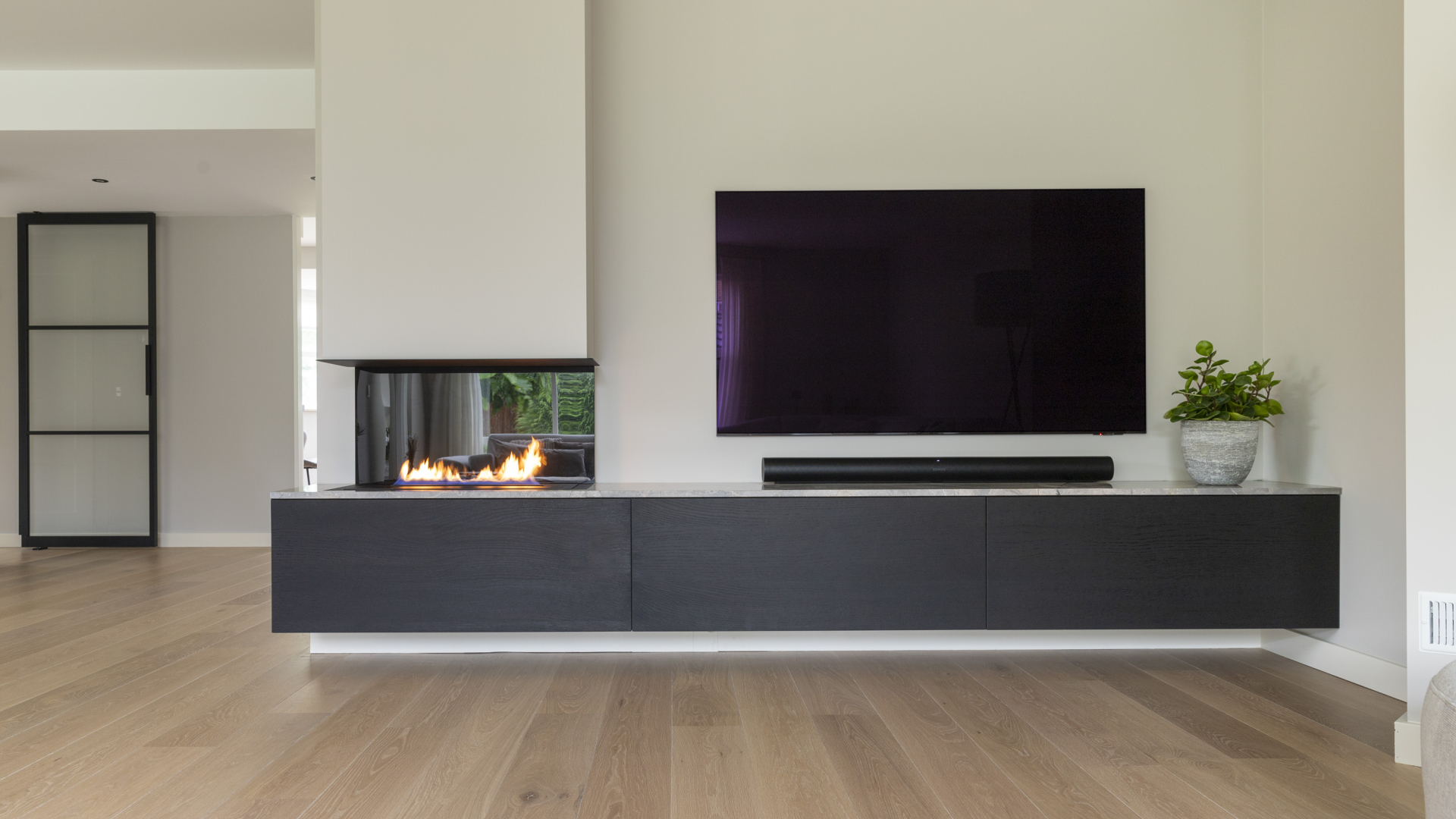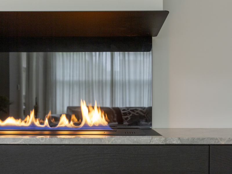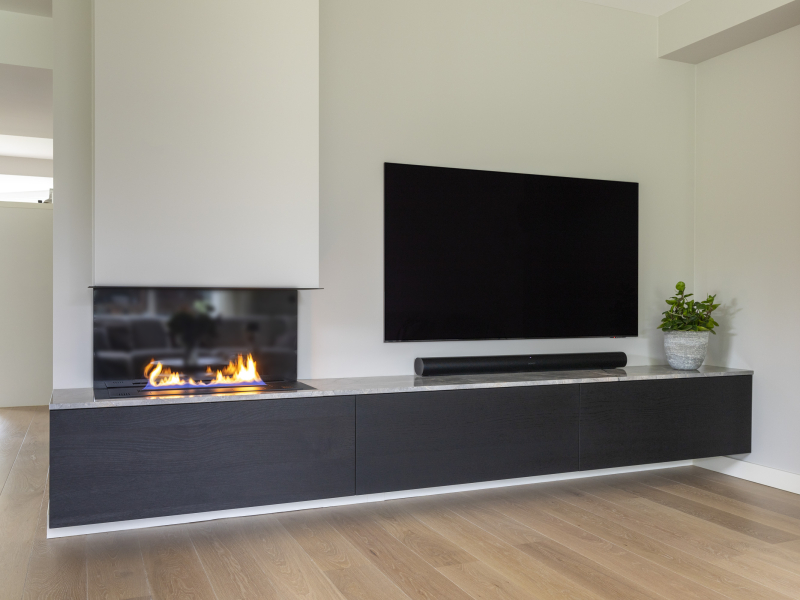 Een haard die verwerkt is in het tv meubel. Het natuursteenblad geeft een chic randje aan het minimalistische ontwerp. We hebben gebruik gemaakt van eiken fineer en in een donkere tint afgewerkt.