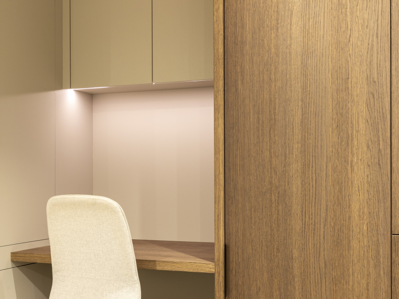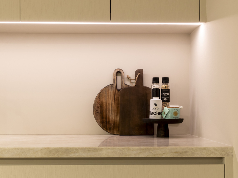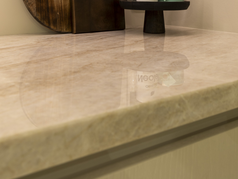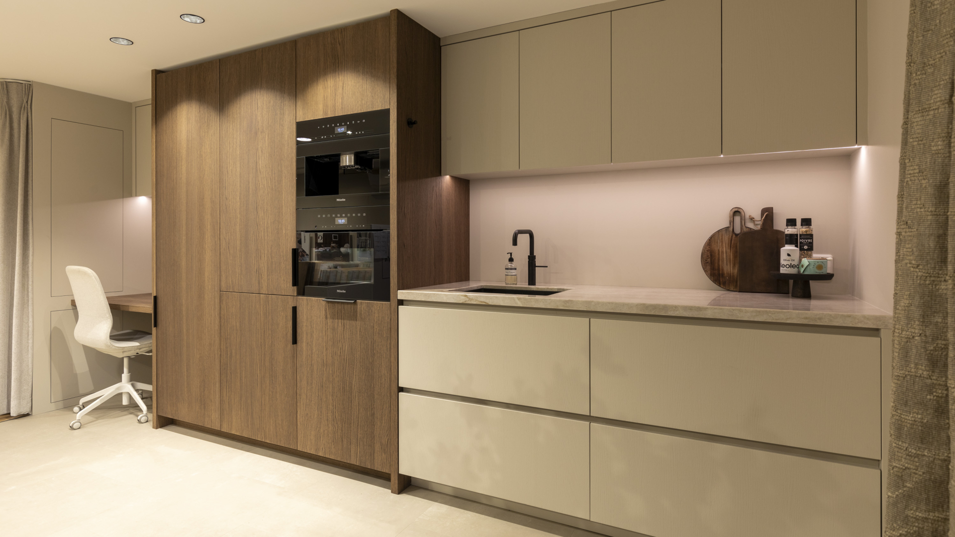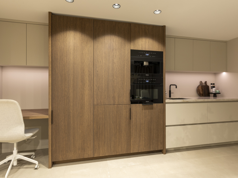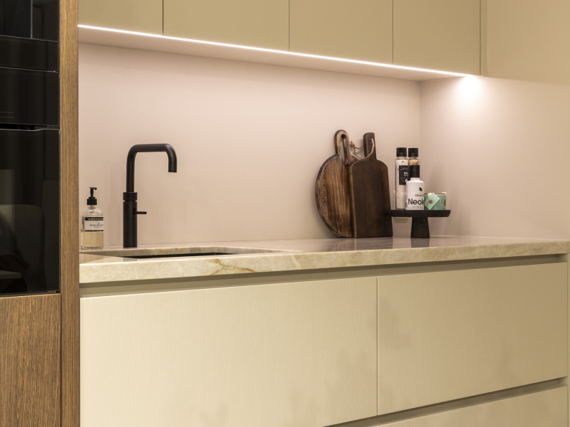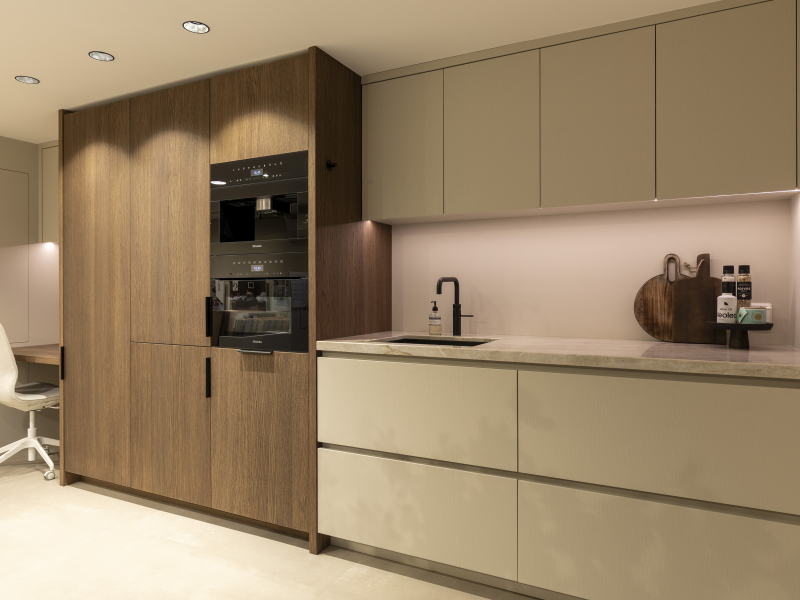 Een combinatie afwerking. Een in een walnoot achtige uitstraling en een in kleur afgewerkt. Voor een speels effect. De keuken is voorzien van een Taj Mahal aanrechtblad.