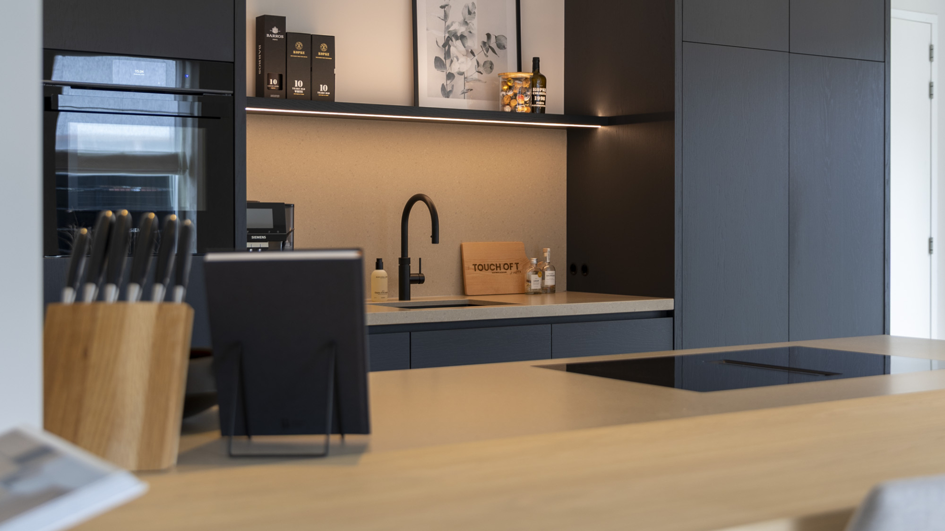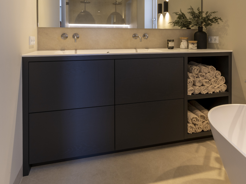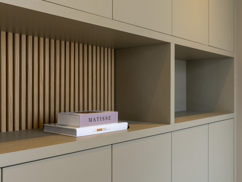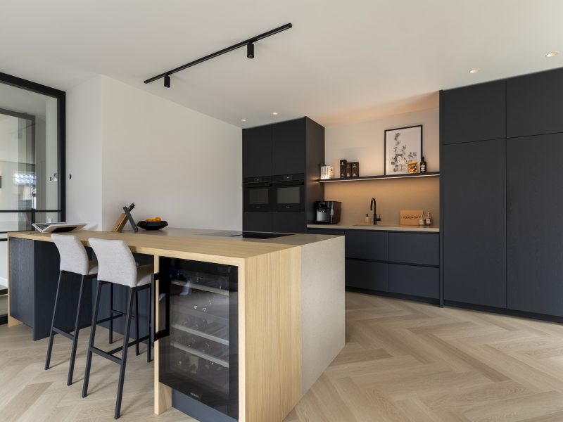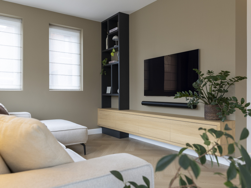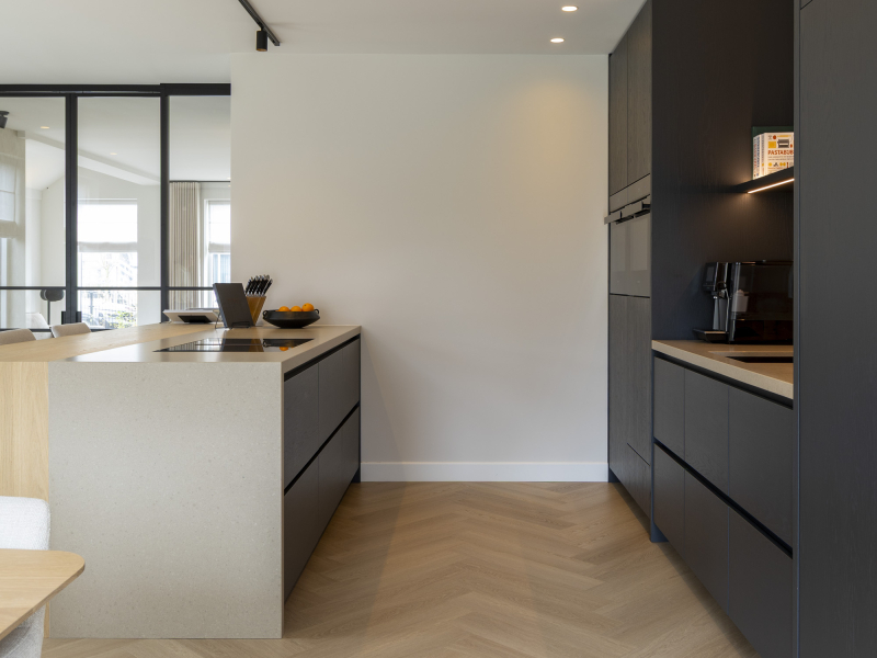 De gehele woning kreeg een verbouwing! Wij mochten de keuken, woonkamer, het kantoor, de inloopkast, de badkamer en het toilet voorzien van maatwerk. Hierbij hebben we gebruik gemaakt van luxe materialen zoals eiken fineer,