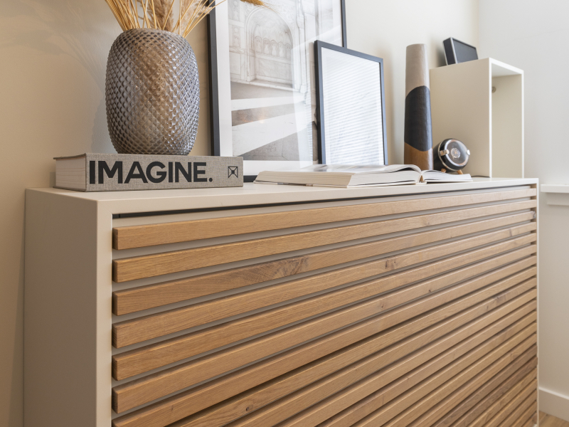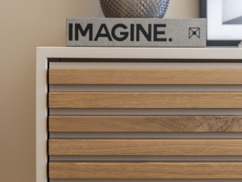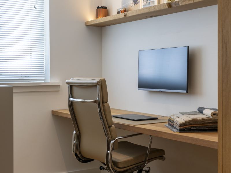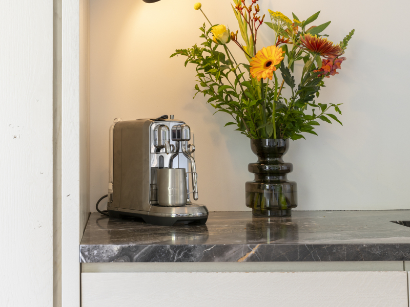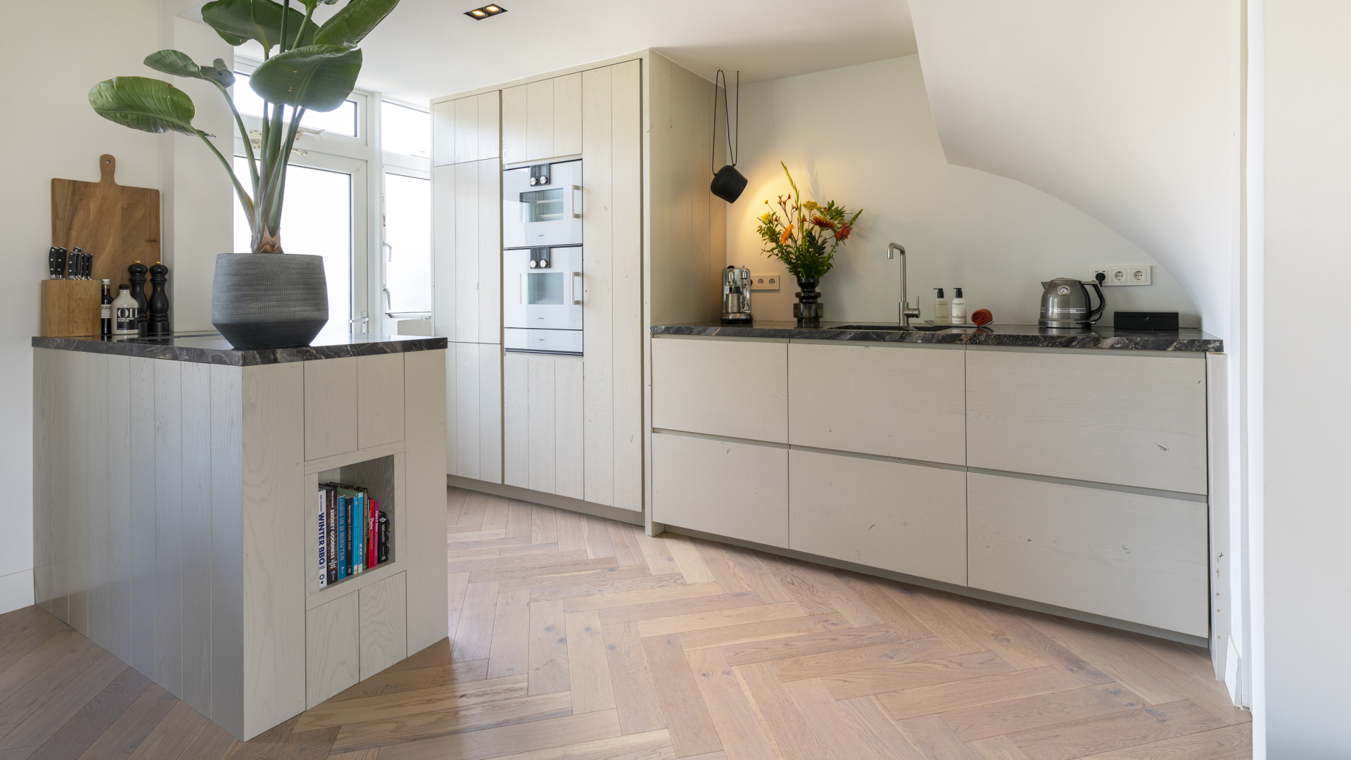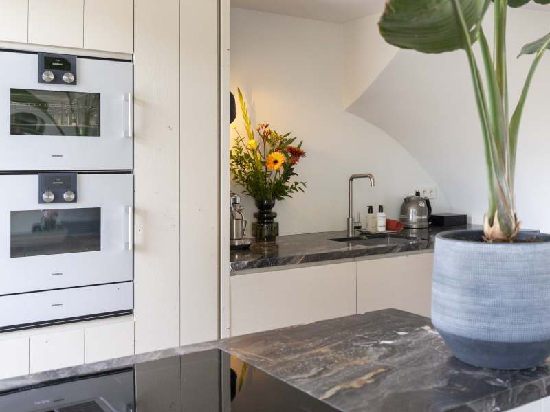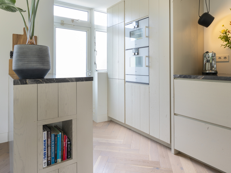 Klein maar fijn én volledig uitgerust! De keuken is voorzien van een stoomoven, combi-oven en warmhoudlade in de hoge kast die tot het plafond gemaakt is. Ook de overige apparatuur is netjes geïntegreerd en het extra diepe werkblad van 80 cm biedt voldoende ruimte. Het nisje aan de zijkant van het eiland zorgt voor een speels detail. In de aparte kantoorruimte is een zwevend lademeubel met 3 ''blinde'' lades geplaatst. Door de horizontale latjes heb je geen greep nodig en is het een strak geheel.